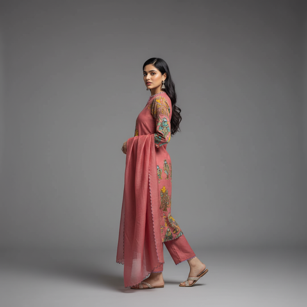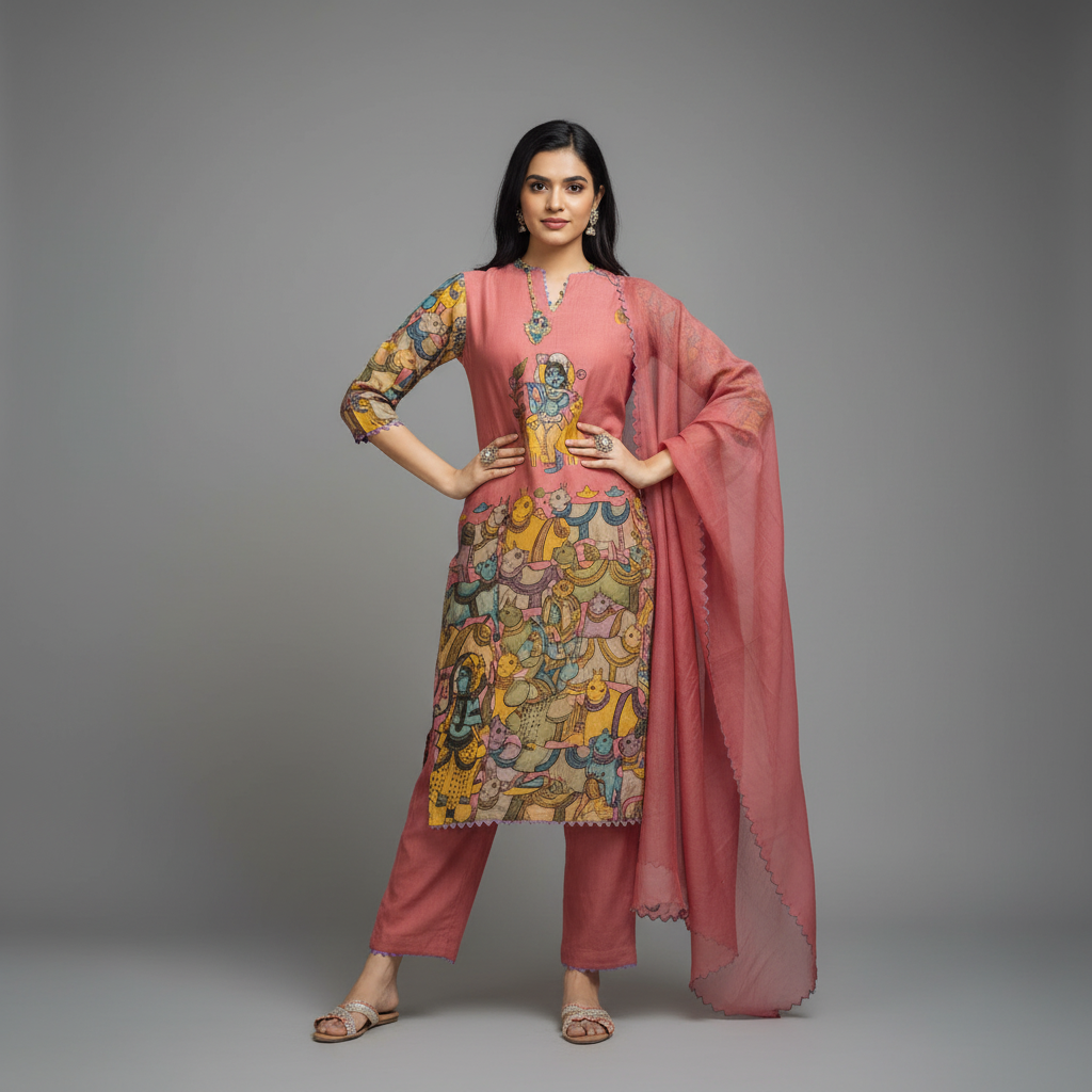 • Work: Coordinated Kalamkari Print, blending beautifully with the kurta and pants